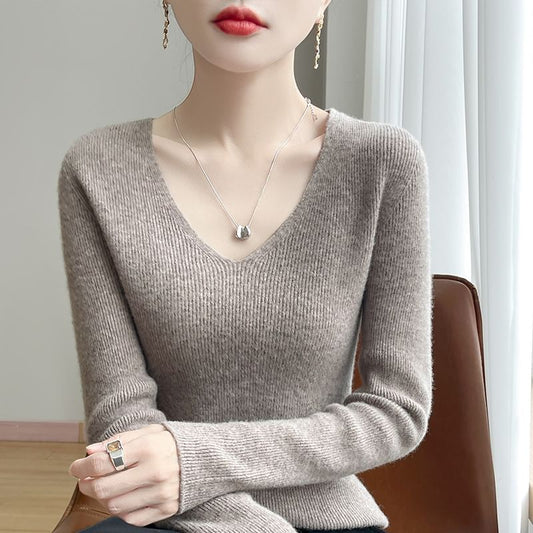 Long-Sleeve V-Neck Plain Ribbed Sweater