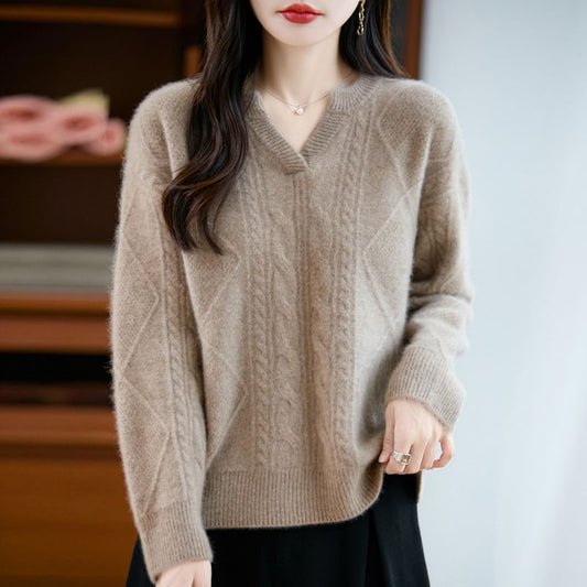 Long-Sleeve V-Neck Plain Cable Knit Sweater