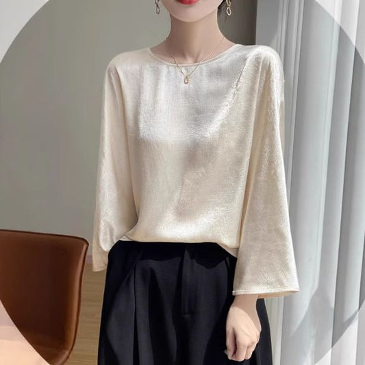 3/4-Sleeve Round Neck Plain Satin Blouse