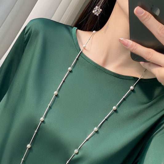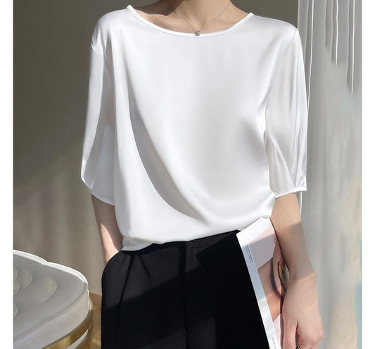 Elbow-Sleeve Crewneck Satin Plain Blouse