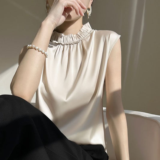 Sleeveless Stand Collar Plain Frill Trim Satin Blouse