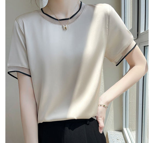 Short-Sleeve Round Neck Contrast Trim Blouse