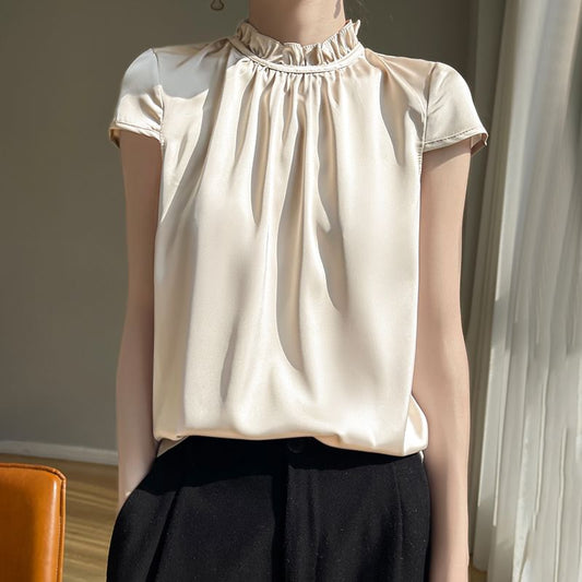 Sleeveless V-Neck Plain Ruched Satin Blouse