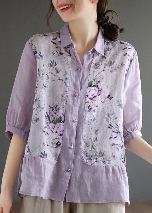 Purple Print Linen Blouse Top Peter Pan Collar Summer LY0242