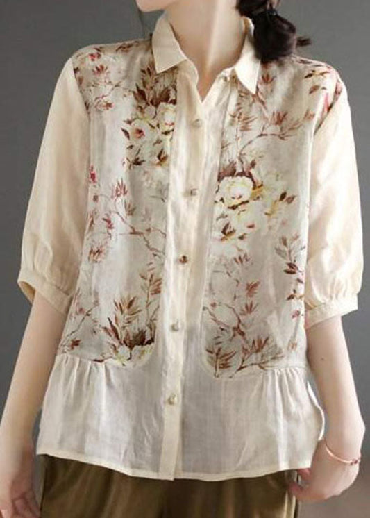 Simple Apricot Peter Pan Collar Print Linen Blouse Top Summer LY0208