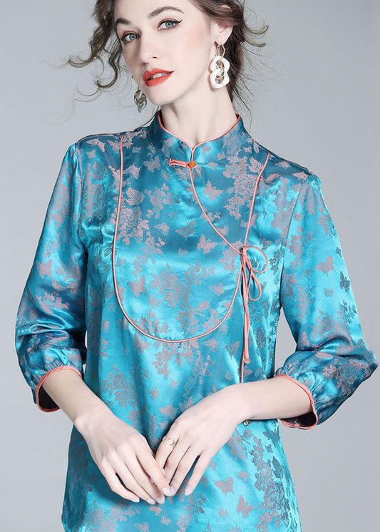 Vintage Blue Stand Collar Patchwork Jacquard Silk Blouse Tops Spring LY0139