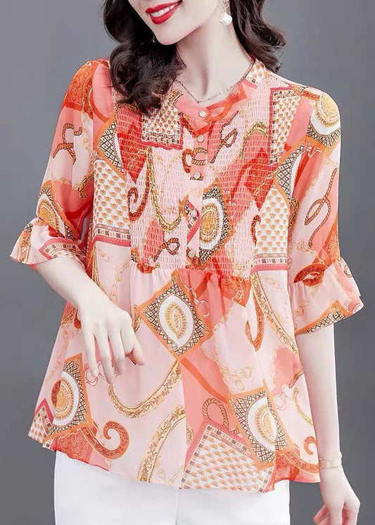 Bohemian Orange Stand Collar Print Patchwork Chiffon Blouses Flare Sleeve TP1010