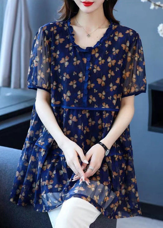 Plus Size Navy Print Wrinkled Patchwork Chiffon Blouse Tops Summer TQ1007