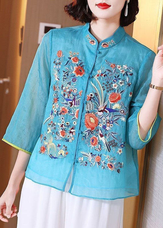 Chinese Style Blue Embroideried Patchwork Chiffon Blouse Tops Summer TP1042
