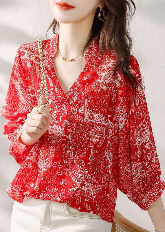 Style Red V Neck Print Patchwork Chiffon Blouses Summer TP1029