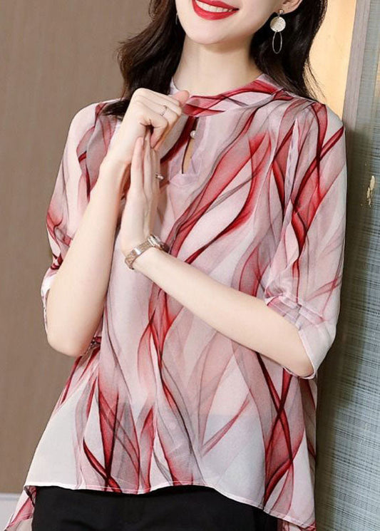 Stylish Red Stand Collar Print Patchwork Chiffon Blouse Top Summer TP1009