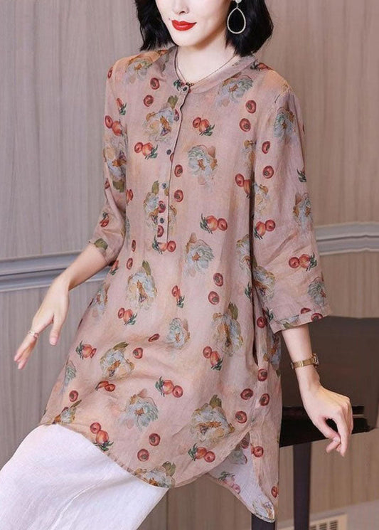 Vintage Pink Print Pockets Patchwork Linen Blouse Top Summer TP1017
