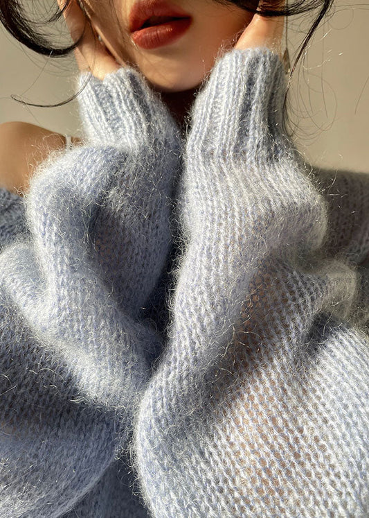 Fashion Blue V Neck Hollow Out Cozy Knit Sweater Tops Spring LC0491