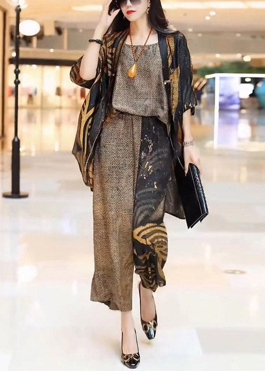 Loose Print Silk Cardigans Top And Wide Leg Pants Three Pieces Set Summer LY3801