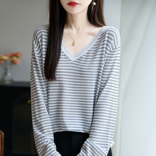 Mock Two-Piece Long-Sleeve V-Neck Two Tone T-Shirt / High Rise Midi Pencil Skirt