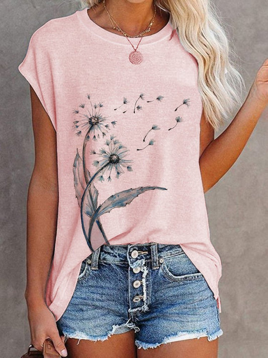 Casual Dandelion Short Sleeve Round Neck Printed Top T-Shirt WZ115