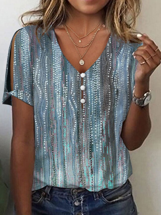 V Neck Floral Buttoned Elegant T-Shirt cc170