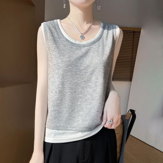 Crew Neck Plain Rhinestone Accent Knit Tank Top