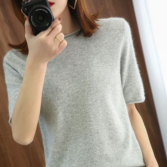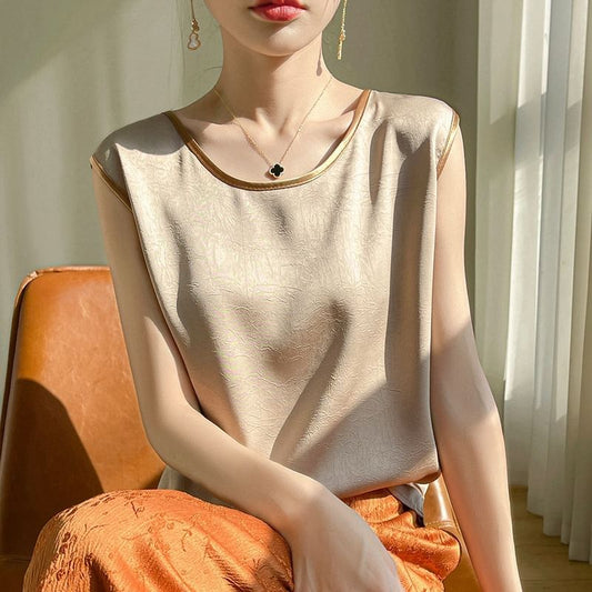 Cap-Sleeve Crew Neck Plain Satin Blouse
