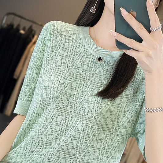 Elbow-Sleeve Crew Neck Patterned Knit Top
