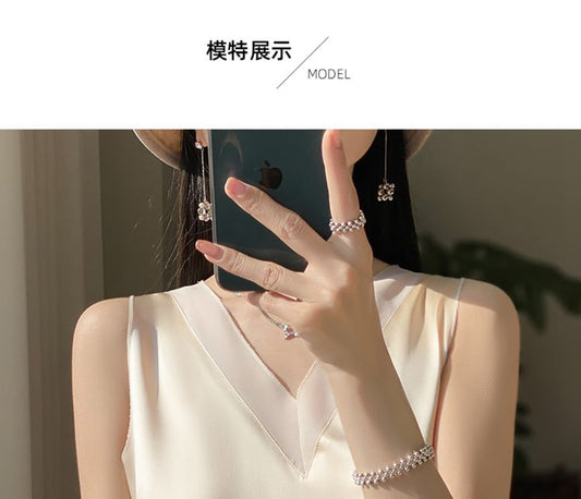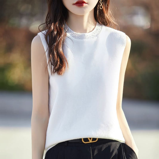 Crew Neck Plain Rhinestone Accent Knit Tank Top