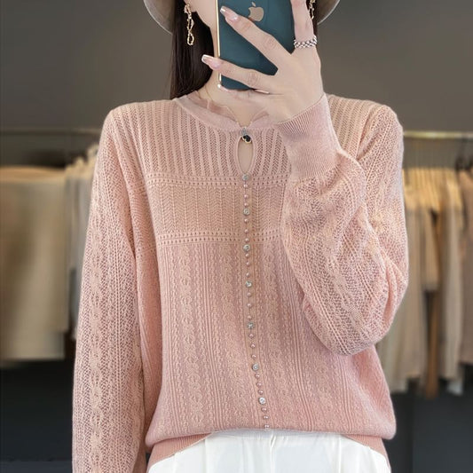 Long Sleeve Frill Collar Plain Beaded Keyhole Knit Top