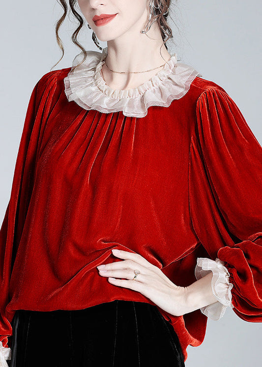 Fashion Black Ruffled Patchwork Silk Velour Shirt Top Spring LY0037
