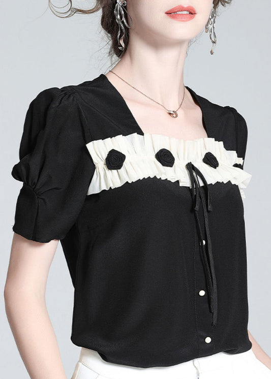 Cute Black Square Collar Patchwork Silk Top Summer LY0107