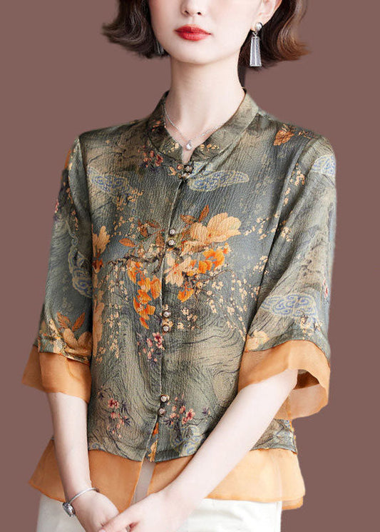 Women Green Stand Collar Tulle Patchwork Print Silk Shirt Tops Half Sleeve LY0042