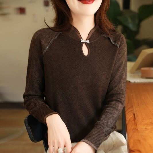 Long Sleeve Frill Collar Plain Beaded Keyhole Knit Top