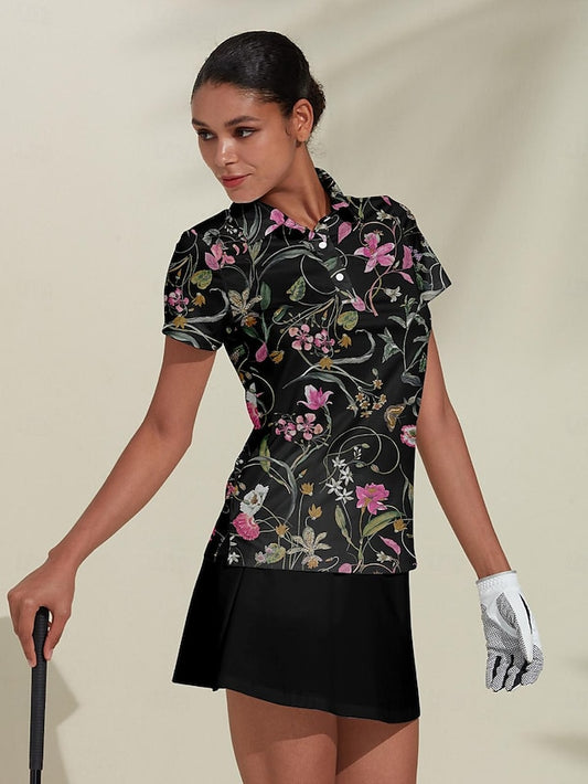 Women's Golf Polo Shirt Black Short Sleeve Top Floral