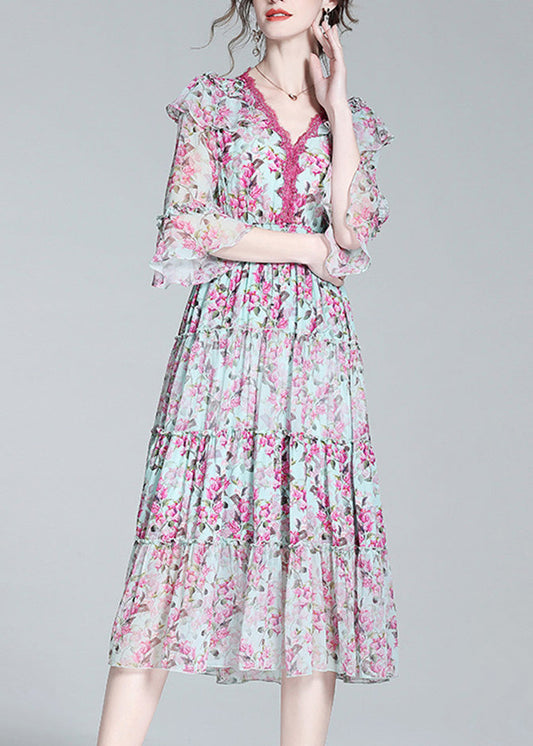 Beautiful Pink V Neck Print Tunic Chiffon Long Dresses Summer LY1519