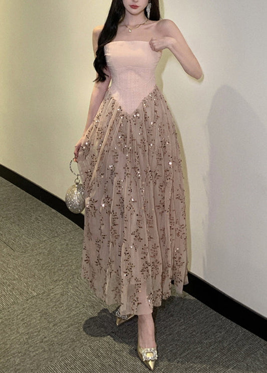 Fitted Pink Patchwork Sequins Tunic Tulle Long Dress Summer LY2699