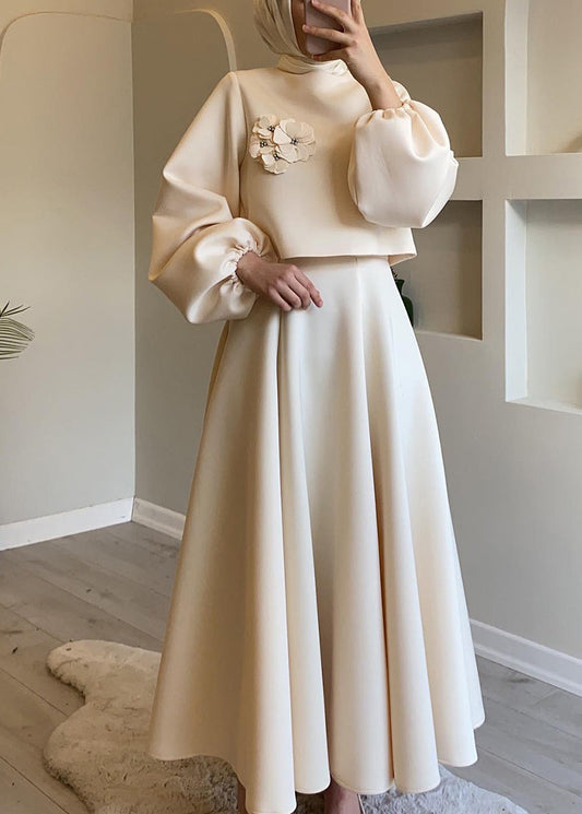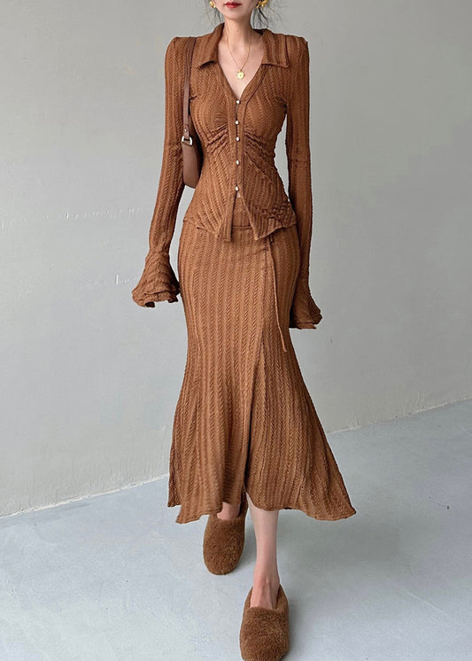 New Caramel Flower Lantern Sleeve Tops And Skirts Two Piece Set QL024