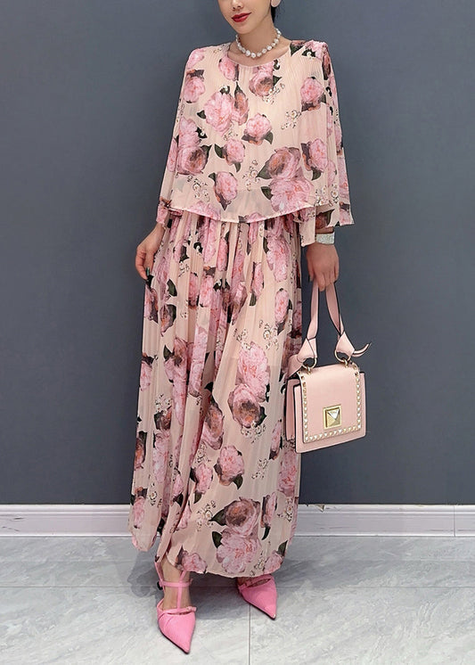 Classy Pink O Neck Print Chiffon Two Piece Set Women Clothing Summer AO1010