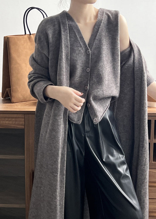Loose Camel V Neck Tank And Cardigan Knit Two Piece Set Fall AF1097