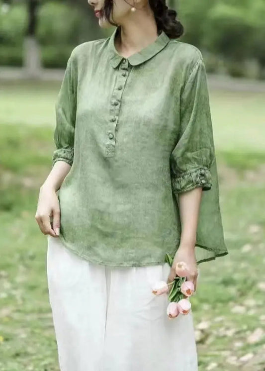 Übergröße, rotes Leinenoberteil mit Peter-Pan-Kragen, Patchwork-Knopf, lange Ärmel, ML0812