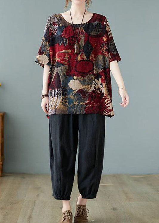 Plus Size Rotes O-Ausschnitt-Print Patchwork Baumwoll-T-Shirt Sommer LY4090