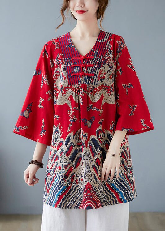 Rotes Top mit V-Ausschnitt und Print in Übergröße, Frühling, LY2941