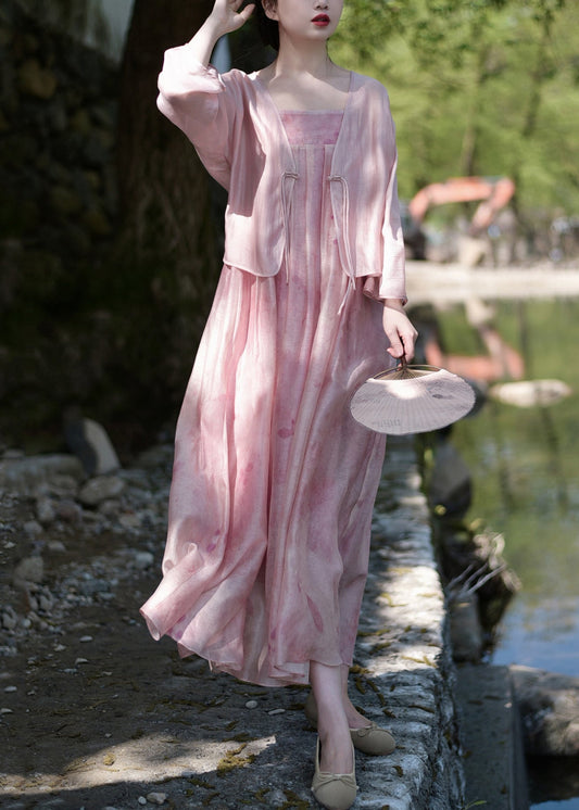 Elegantes rosa Chiffonhemd mit chinesischem Knopfdruck, Sommer AU1066