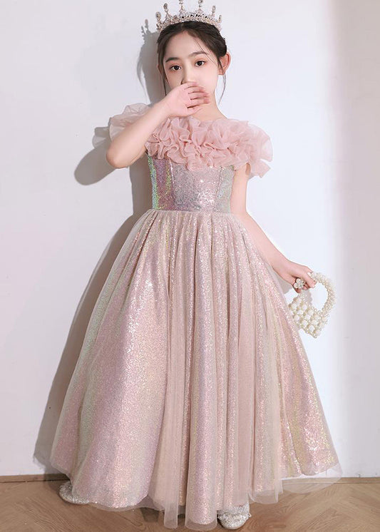 Elegante Rosa Quadrat Kragen Bogen Pailletten Tüll Mädchen Maxi Kleider Frühling YS038