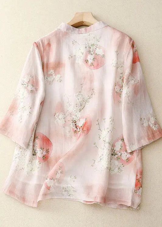 Elegantes rosa Stehkragen-Print Patchwork Baumwollhemd Top Sommer LY8299