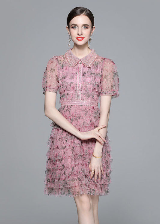 Elegantes rosa Stehkragen-Faltendruck-Patchwork-Chiffon-Kleid Sommer LY1234