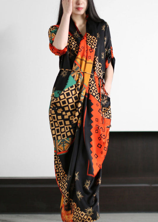 Boho Schwarzes, faltiges Patchwork-Seidenkleid mit Bindegürtel für den Sommer LY5166