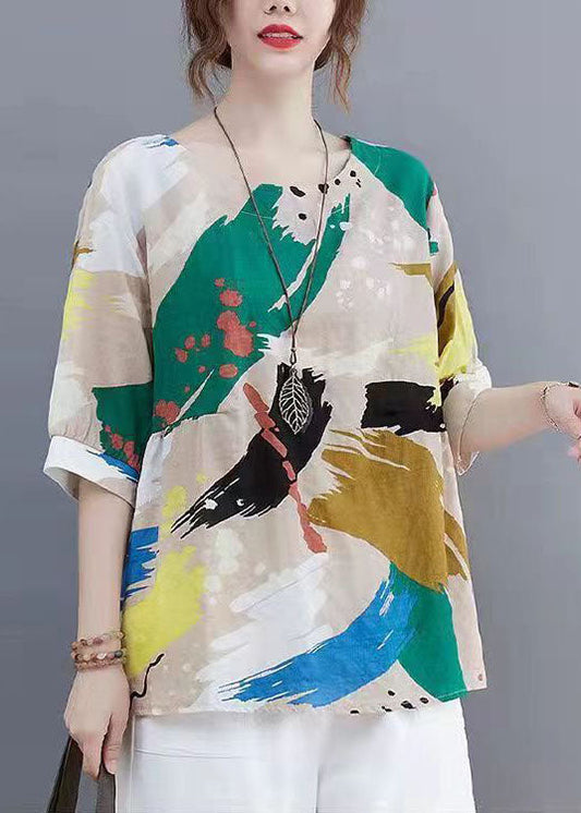 Boho Colorblock O-Ausschnitt Patchwork Leinen T-Shirt Sommer LY4083