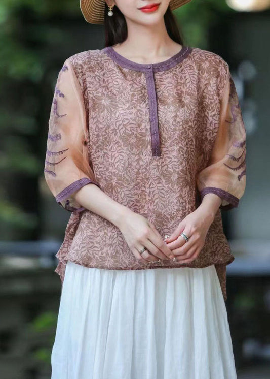 Boho Grünes O-Ausschnitt Organza Besticktes Patchwork Leinen Top Sommer LY4077