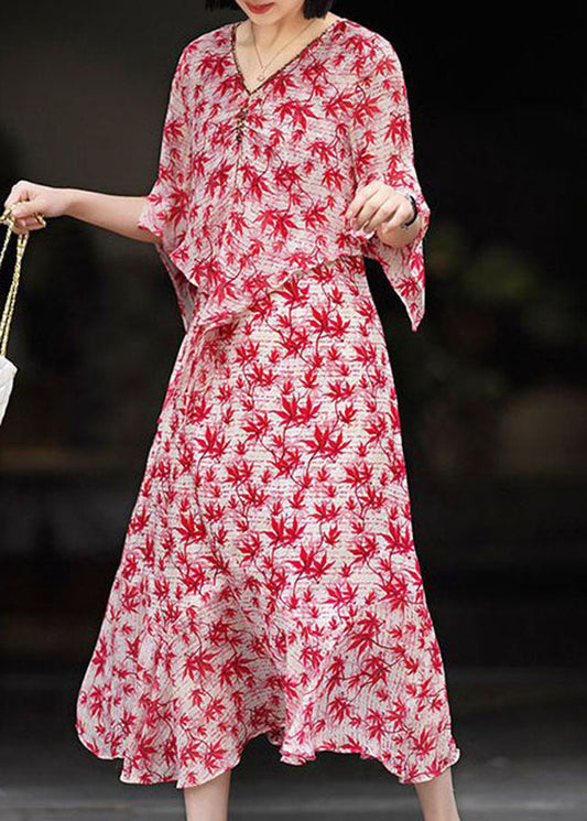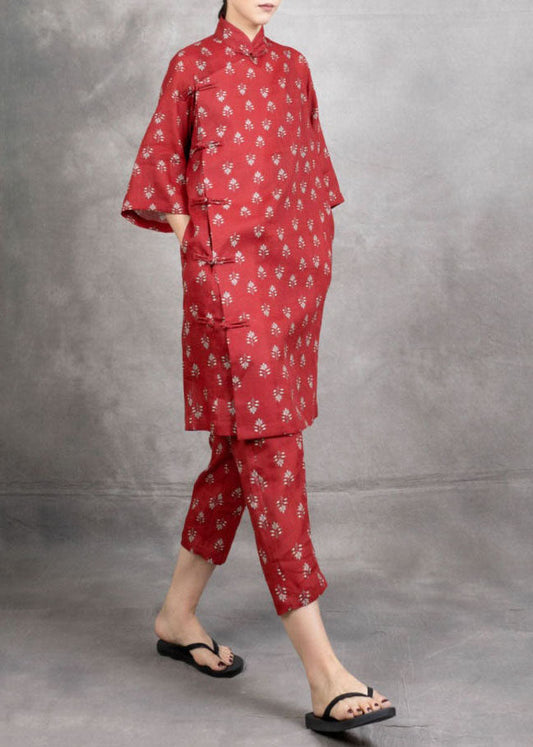 Boho Rot Stehkragen Patchwork Leinen Frauen Sets 2 Stück Sommer LY4573
