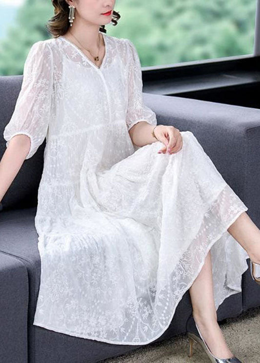 Boho Weiß V-Ausschnitt Besticktes Patchwork Seiden-Zweiteiler-Set Sommer LY4610