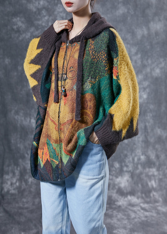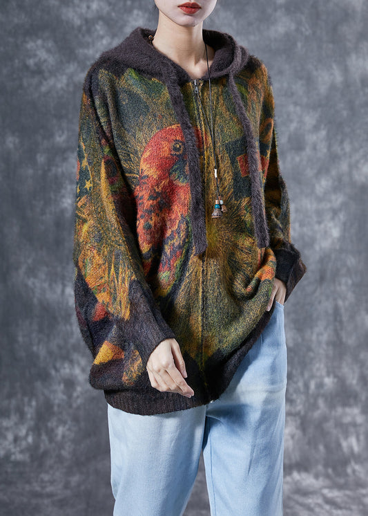 Kaffeefarbener, übergroßer Strickmantel aus Kaninchenhaar mit Kapuze und Aufdruck für den Winter LY4064