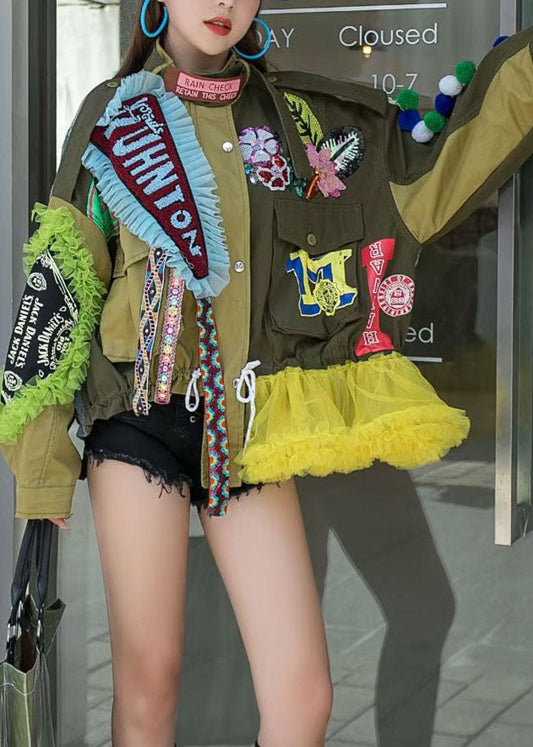 Moderne Armeegrüne Tüll-Pailletten-Patchwork-Jeansjacke Frühling F4214